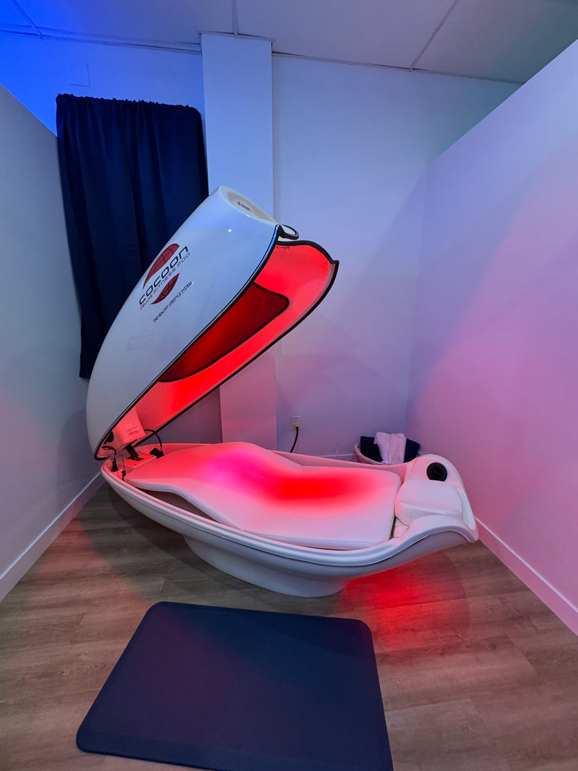 The cocoon fitness pod provides a range of various wellness benefits including RLT, infrared sauna, and vibrational massage. The cocoon aids in weight loss by reducing water retention, bloating, and toxins. The infrared sauna advances weight loss through sweating and calorie burning. The cocoon also offers to take you through a workout using resistance bands to further your wellness journey.